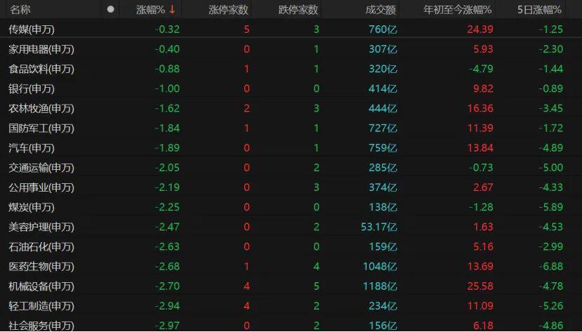 相比之下,大消费板块表现相对抗跌,传媒、家用电器、食品饮料、银行等板块跌幅均不超过1%。