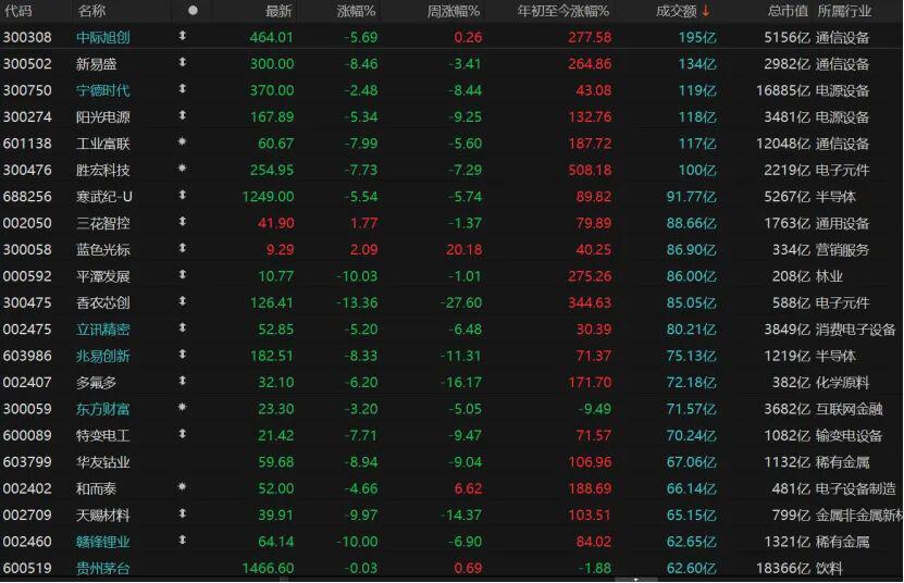 盘面呈现“一片绿”,英伟达概念、存储芯片、BC电池、HIT电池、通信设备等板块均跌约6%,电子元件、输变电设备、化肥农药跌幅超5%,稀有金属、有机硅也遭遇重挫。