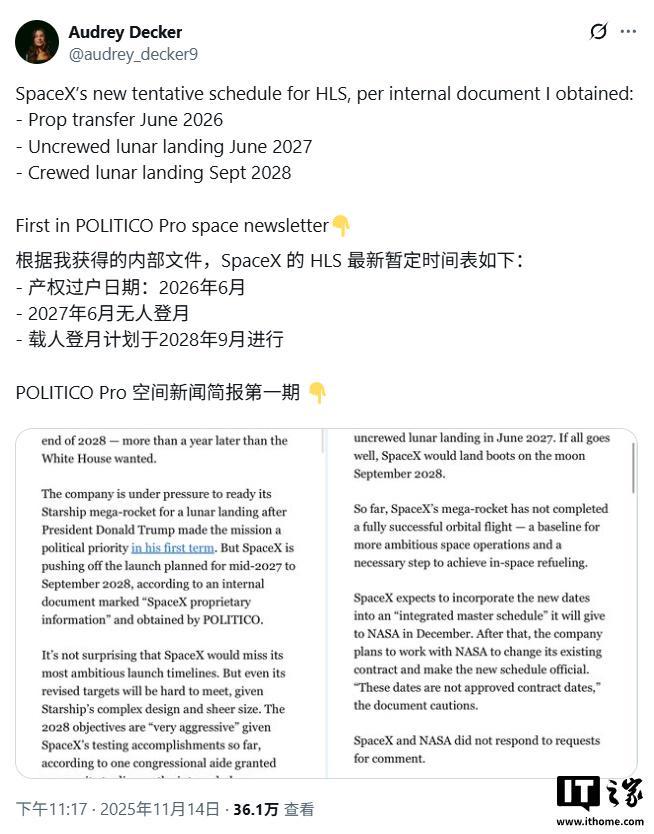 IT之家 11 月 22 日消息,科技媒体 Golem 昨日(11 月 21 日)发布博文,报道称基于最新披露的 SpaceX 内部文件,原计划于 2027 年执行的美国国家航空航天局(NASA)“阿尔忒弥斯 3 号”(Artemis-III-Mission)载人登月任务,将推迟至 2028 年。