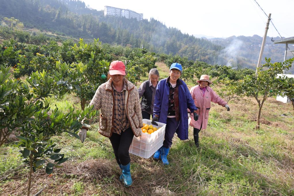 11月26日,石喊山村村民在基地采摘柑橘